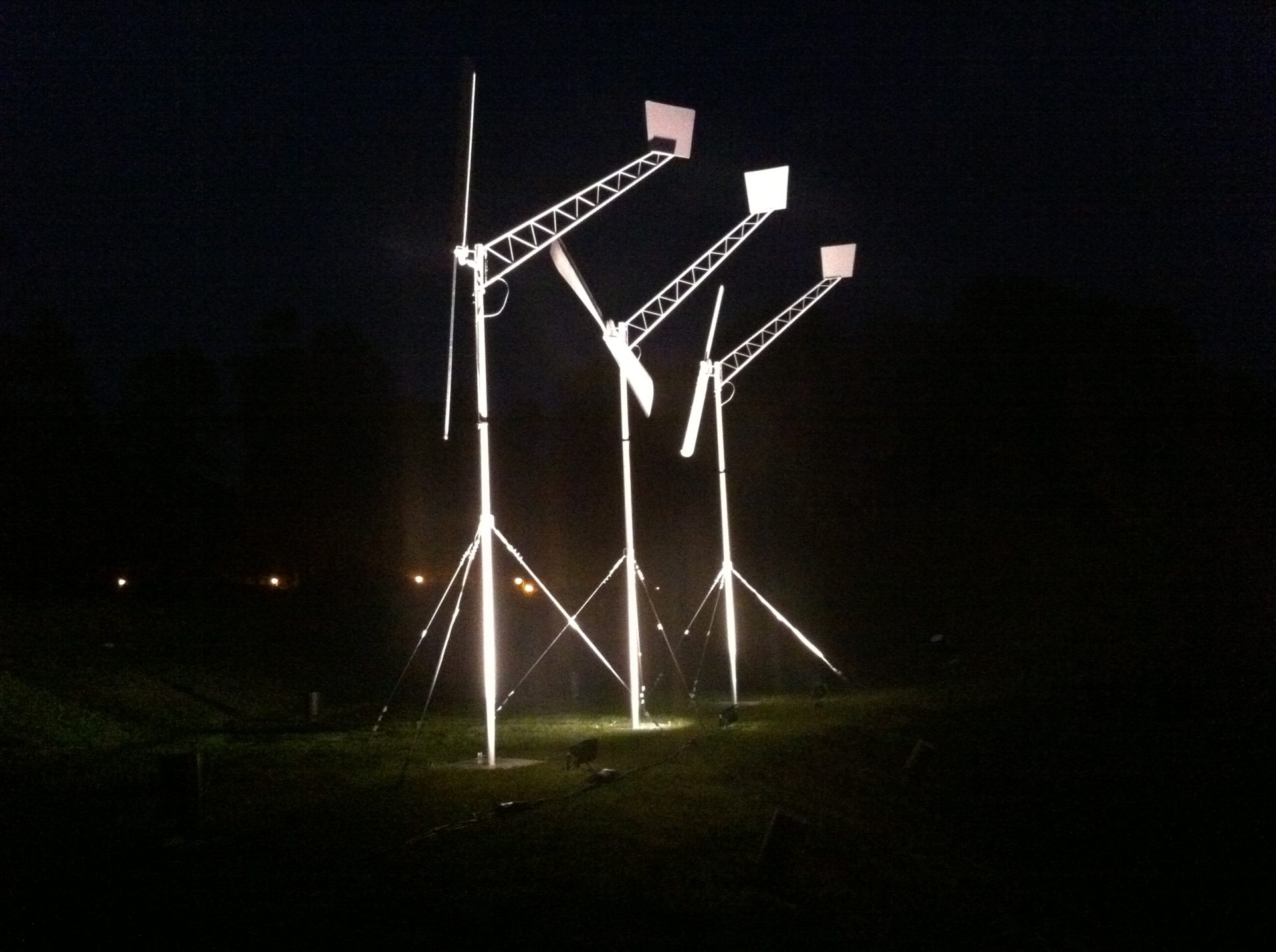 Trois éoliennes sont réparties dans un champ, sur un toit, un parking… Une musique est diffusée dans l’espace en fonction du vent. le visiteur pénètre graduellement la zone de l’installation définie…