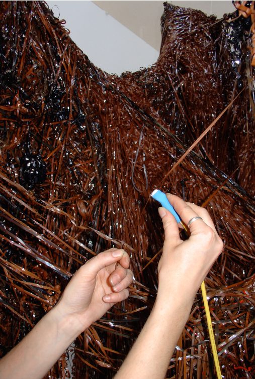 Dans une pièce se trouve un tas conséquent de bandes magnétiques audio. Ce tas organique est suspendu au plafond. Deux câbles jaunes émergent de cette masse. Au bout de chacun d’eux une tête de…